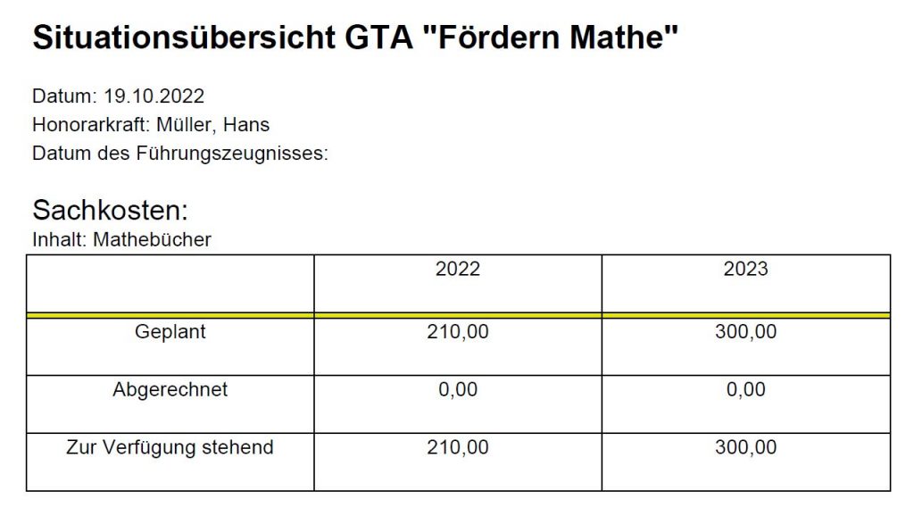 Im Laufe des Schuljahres kann immer mal wieder die Frage der GTA-Schaffenden an Ihrer Schule aufkommen, wie die aktuelle Situation bei Ausgaben und Abrechnungen für das jeweilige Angebot ist. Mit welchen Summen wurde geplant? Welche Rechnungen sind bereits abgerechnet? Wie viele Sachkosten können noch veranschlagt werden? Um diese Fragen zu beantworten, bietet FABelF ein Dokument an, die pdf-Datei „Situationsbericht Honorarkraft“.