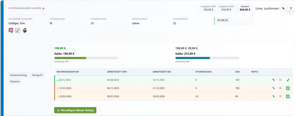 Diese Zielvorgabe gilt auch für den Abrechnungsteil von Kostenarten, wie hier am Beispiel eines Honorarvertrages: